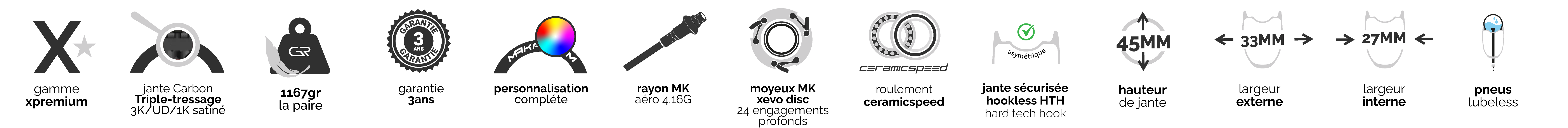 Nos jantes MK xpremium 100% carbone total U de 33mm de large sont techniquement inégalées. Un triple tressage 3K/UD/1K T800 à haute tension et son poids ahurissant de 345gr pour 45mm de haut, des largeurs techniquement ultime au travail du pneu. Elles seront des alliés rêvés de tout passionné. Elles possèdent des fonds de jantes par bandes de graphène permettant d’augmenter encore la structure de jante. Des cercles à technologies hookless MK HTH (Hard Tech Hook) donneront une résistance optimale pour l’accroche du pneus et seront 100% compatible tubeless.