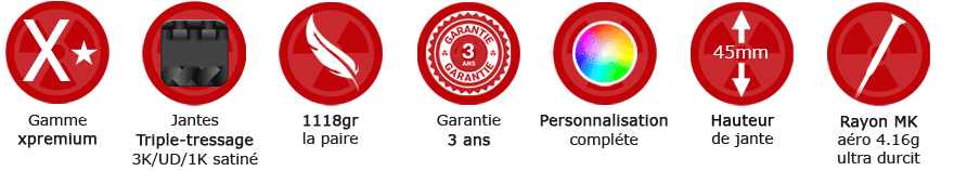 Nos jantes MK xpremium 100% carbone total U de 26mm de large sont techniquement inégalées. Un triple tressage 1K/3K/UD T800 à haute tension avec une résine de liage HP et son poids ahurissant de 345gr. Elles seront des alliés rêvés de tout passionné. Elles possèdent des fonds de jantes par bandes de graphène permettant d’augmenter encore la structure de jante.