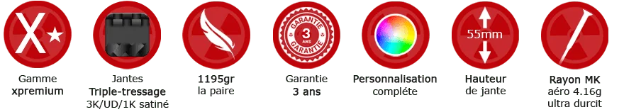 Nos jantes MK xpremium 100% carbone total U de 26mm de large sont techniquement inégalées. Un triple tressage 1K/3K/UD T800 à haute tension avec une résine de liage HP et son poids ahurissant de 395gr sont les alliés rêvés de tout passionné. Elles possèdent des fonds de jantes par bandes de graphène permettant d’augmenter encore la structure de jante.