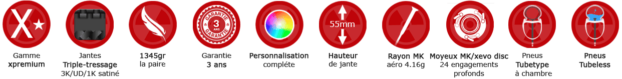 Nos jantes MK xpremium 100% carbone total U de 26mm de large sont techniquement inégalées. Un triple tressage 1K/3K/UD T800 à haute tension et son poids ahurissant de 435gr. Elles seront des alliés rêvés de tout passionné. Elles possèdent des fonds de jantes par bandes de graphène permettant d’augmenter encore la structure de jante. Des crochets HTH (Hard Tech Hook) donneront une résistance optimale pour l’accroche du pneus et seront 100% compatible tubeless.