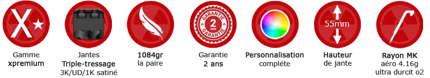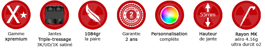 Nos jantes MK xpremium 100% carbone total U de 24,3mm de large sont techniquement inégalées. Un triple tressage 1K/3K/UD T800 à haute tension avec une résine de liage HP et son poids ahurissant de 335gr sont les alliés rêvés de tout passionné. Elles possèdent des fonds de jantes par bandes de graphène permettant d’augmenter encore la structure de jante.