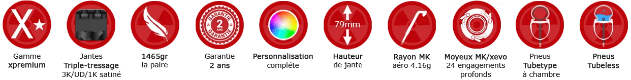 Nos jantes MK xpremium 100% carbone total U de 24,3mm de large sont techniquement inégalées. Un triple tressage 1K/3K/UD T800 à haute tension avec une résine de liage HARDTECH et son poids ahurissant de 395gr sont les alliés rêvés de tous passionnés. Elles possèdent des fonds de jantes par bandes de graphène permettant d’augmenter encore la structure de jante.