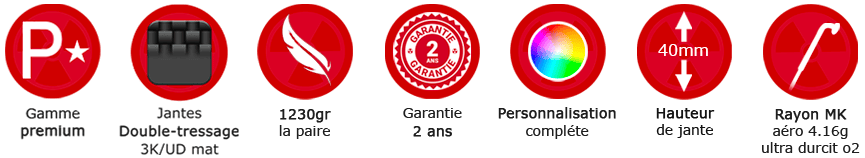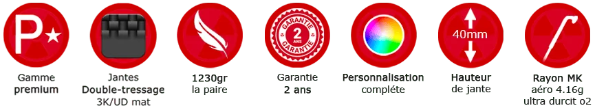 Cette gamme de roues en total U possède les mensurations suivantes : 25,4mm de large à la surface de freinage et 27mm au plus large du U. La jante MK premium 100% carbone total U double tressage 3K/UD T700/800 en finition mat donnera une explosivité hors norme en filtrant les aspérités de la route.