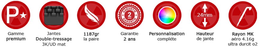La jante MK premium 100% carbone semi U double tressage 3K/UD T800 en finition mat donnera une explosivité hors norme en filtrant les aspérités de la route, les xslim 24 vous donneront une très bonne fraîcheur en fin de sortie. Elles restent néanmoins très polyvalentes pour les parties moins pentues et ne brident pas le cycliste.